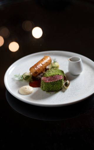 For the main course, savour a tender Angus eye fillet accompanied by potato terrine, spring onion, and a rich sauce bordelaise.