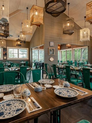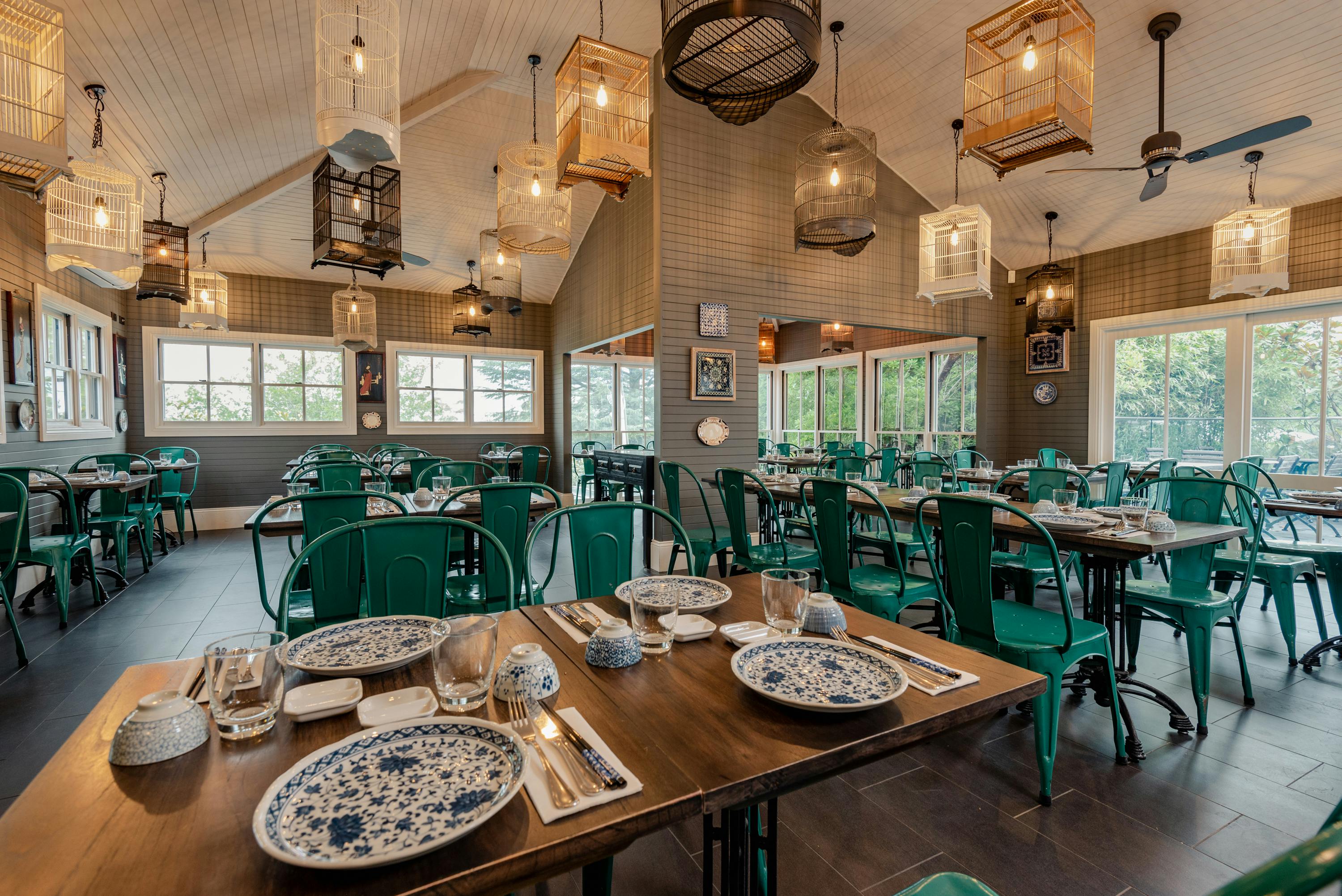 The dining space is breezy and casual, lit by suspended vintage birdcages with the open kitchen setting the tone.