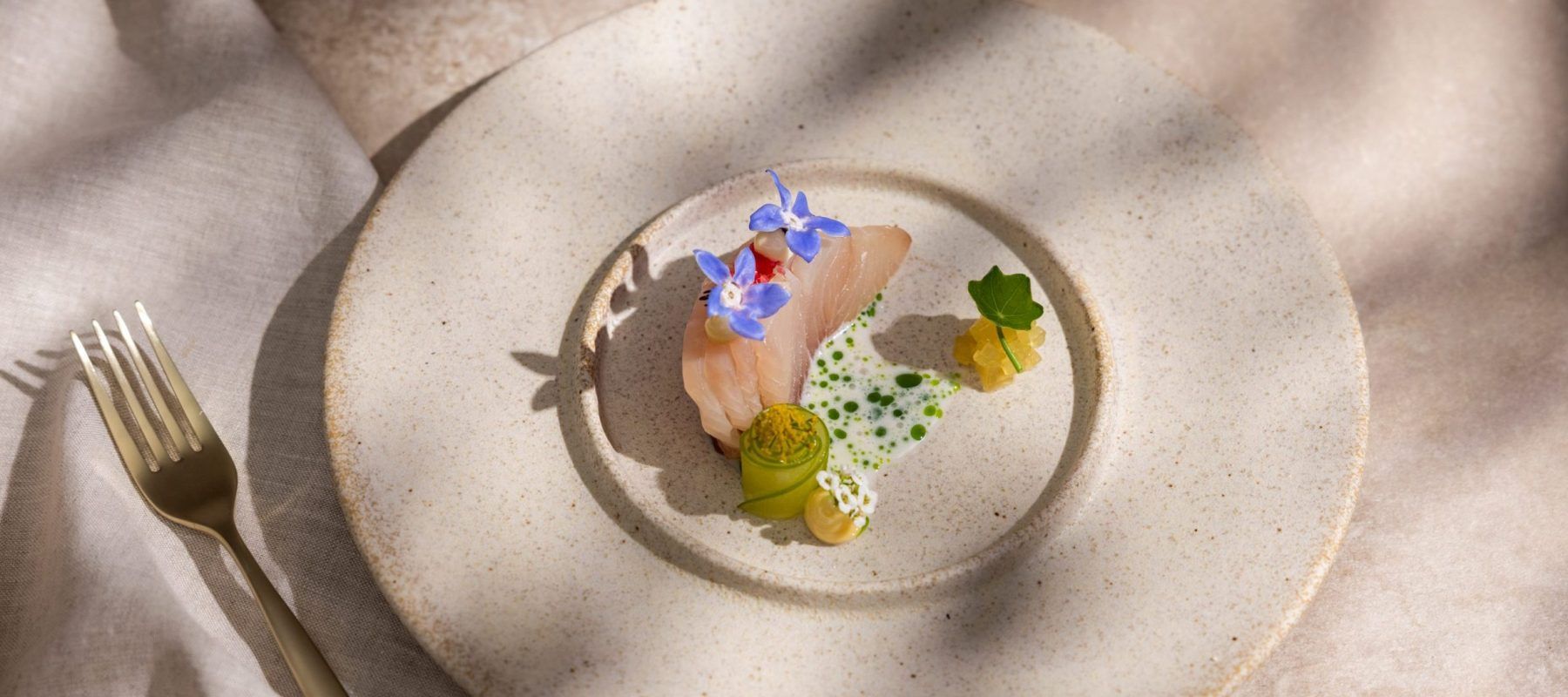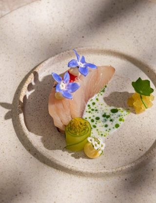 Yuzu cured Murray cod, finger lime emulsion, pickled vegetables, garden herbs