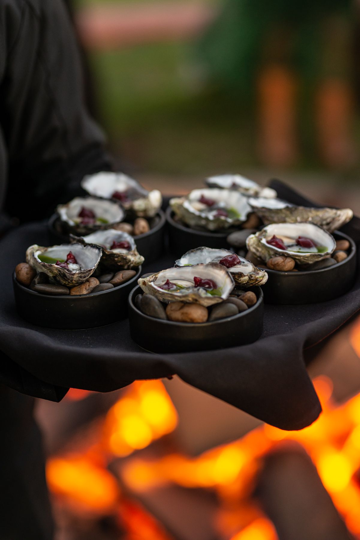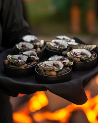 Firewood baked oysters, charred Davidson plum